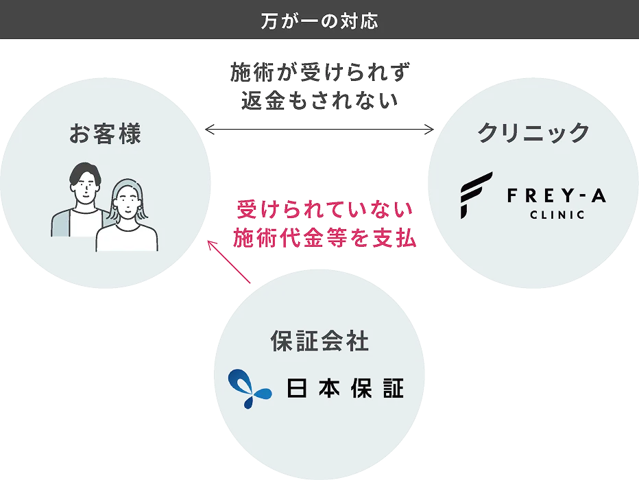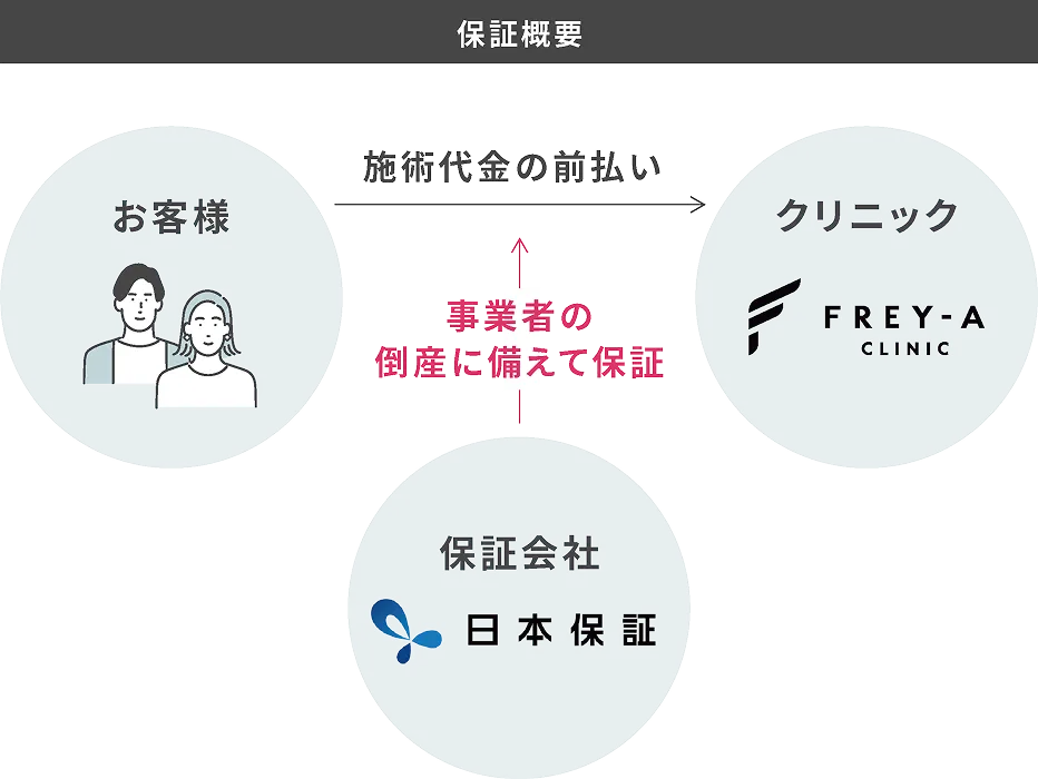 「前払金保証」とは、万が一クリニックが経営困難に陥り、施術が受けられなくなった場合、未消化分の施術代金等を株式会社日本保証が代わりに返金をする保証制度。